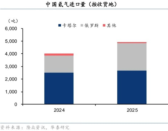 数据显示,2025年全球氦气供应量约1.9亿立方米。其中,卡塔尔占比33%,俄罗斯占比9.5%。2025年中国自俄罗斯进口氦气1304万立方米,占俄罗斯产量的72.4%。